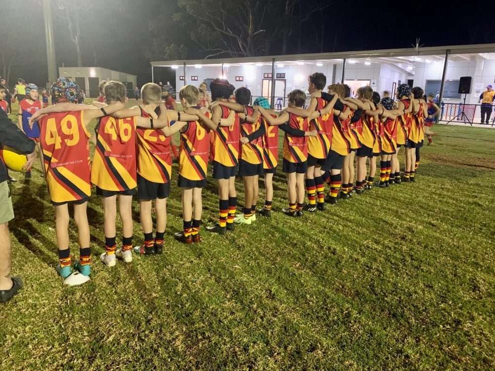 Across Round 9 of the season, our teams from Auskick upwards paid their respects to those impacted by the Greta bus tragedy, especially those associated with the Singleton Australian Football Club. Our teams wore arm bands, either black or red & white (being the Singleton Roosters colours), and held a minute’s silence prior to the start of all games.