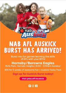 Auskick Burst is here! What it means is that your child(ren) can join our Auskick program for the last 5 weeks of the season for $55. They get the fun of the last 5 sessions (16/7, 23/7, 30/7, 6/8 & 13/8), which includes our huge End of Season Auskick event on 13/8. You child will also get sent a pack of goodies from the AFL. Best of all, you get to be part of all the happenings within our Hornsby Berowra Eagles AFL Club!
