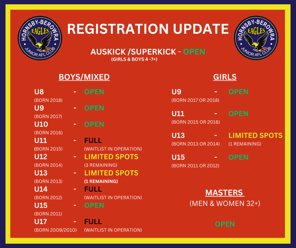Due to the number of registrations already received for some age groups, we have had to close off registrations as teams have reached the capacity for the number of players allowable. We have also had to do so, as we cannot be confident that we would receive enough registrations to form an additional team at this stage. For age groups which we have had to close off registrations, we are compiling a waitlist in the event that an already registered player is no longer able to play for the season, or should we have sufficient interest to be able to confidently form an additional team. We do encourage you to add your child to the waitlist, as we would love to be able to add an additional team where possible. To place your child on a wait list for any of the age groups which have closed, email Neil Saunders (registrar) on registrar@hornsbyberowraeagles.com